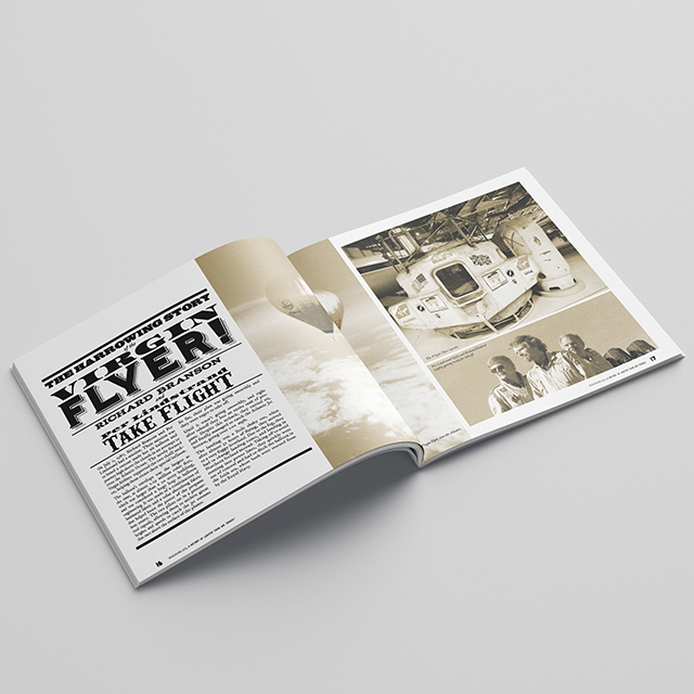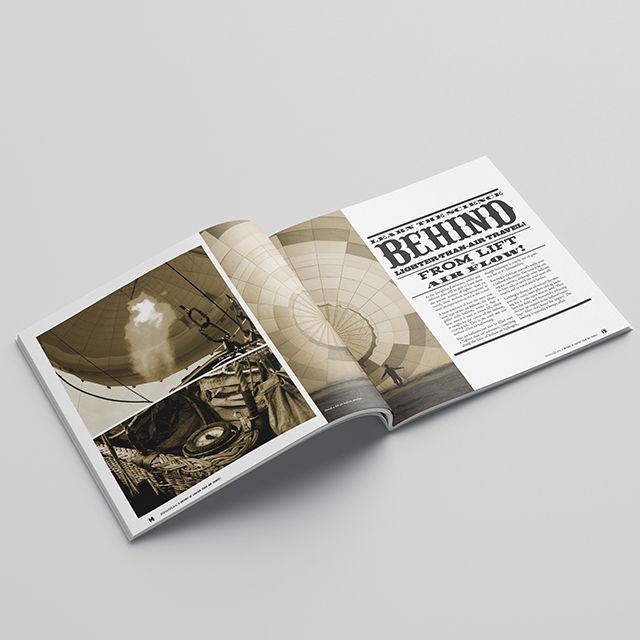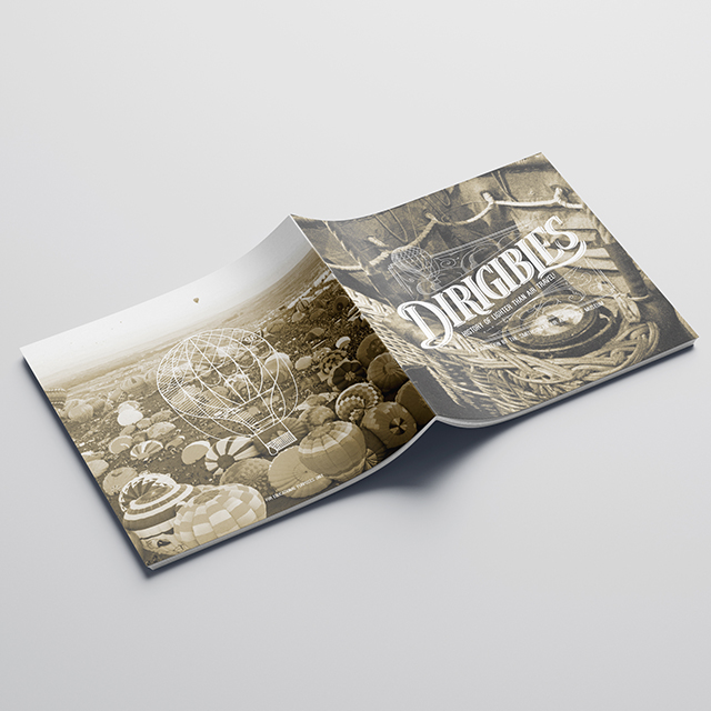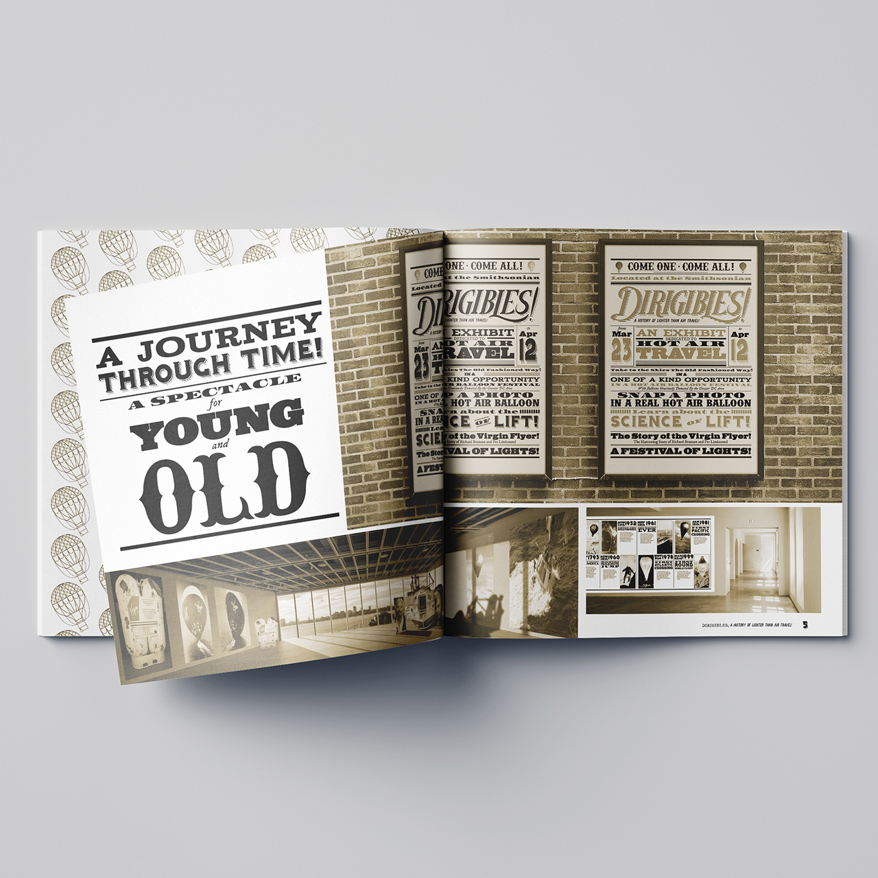 A catalog about an exhibition in the Smithsonian Air and Space Museum about the history of the earliest version of flight; the hot air balloon. The small booklet contains spreads about the exhibitions, including mockups of the various rooms, a timeline, the 'Virgin Flyer' main exhibit, and mockups of the gift shop. Victorian typefaces and design sensibilities were utilized, along with hand-done typography and illustrations.