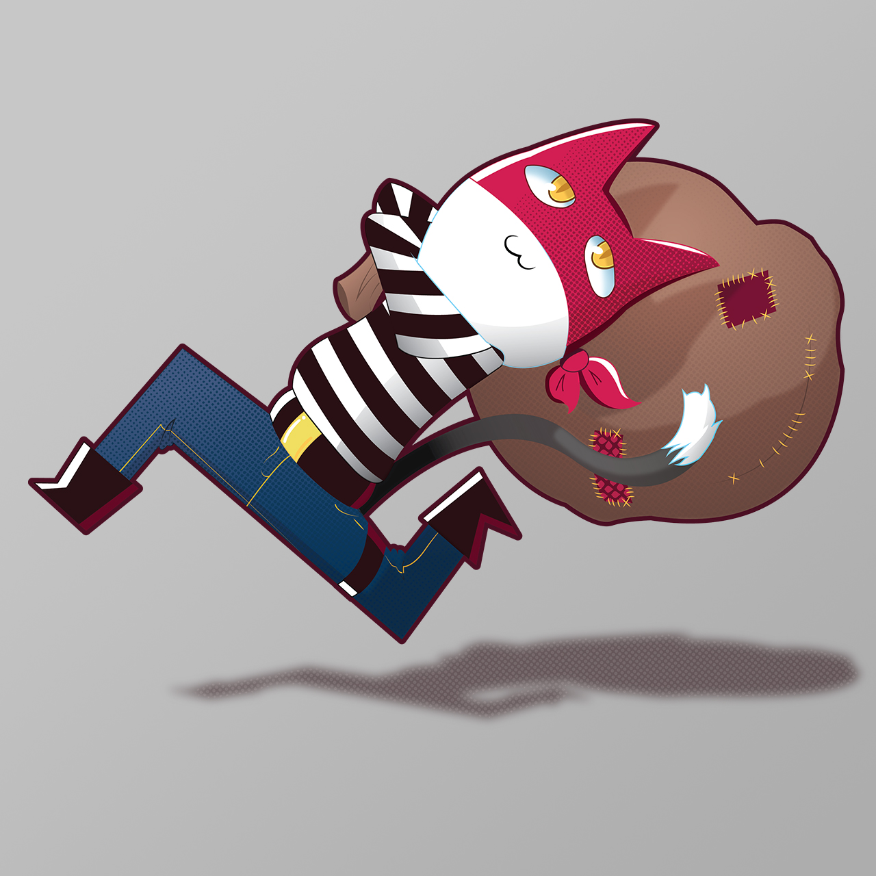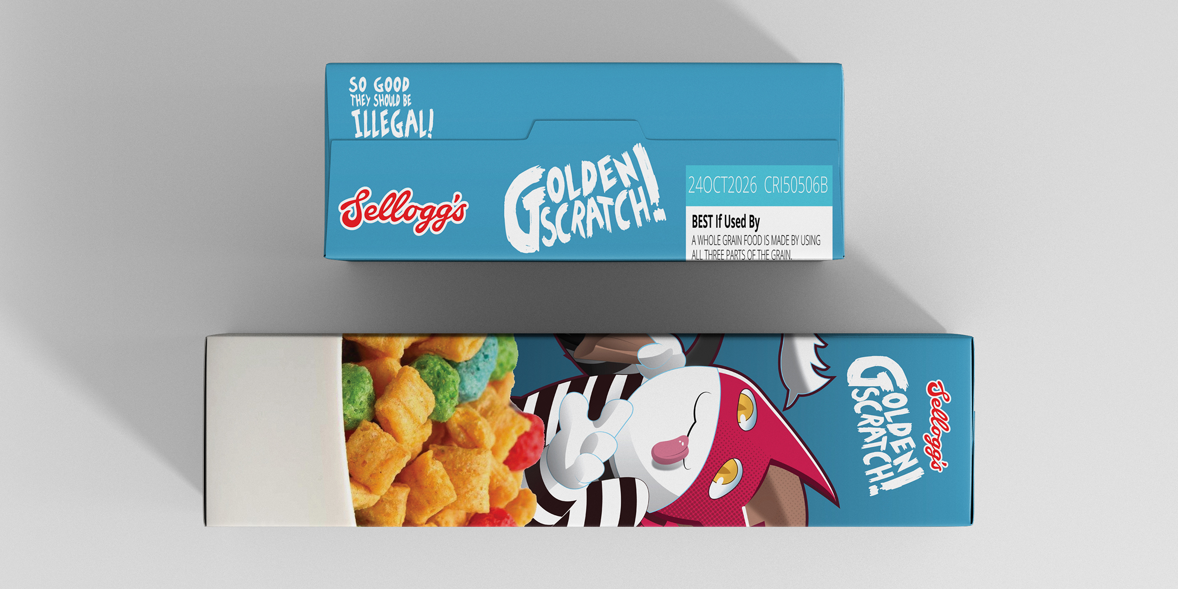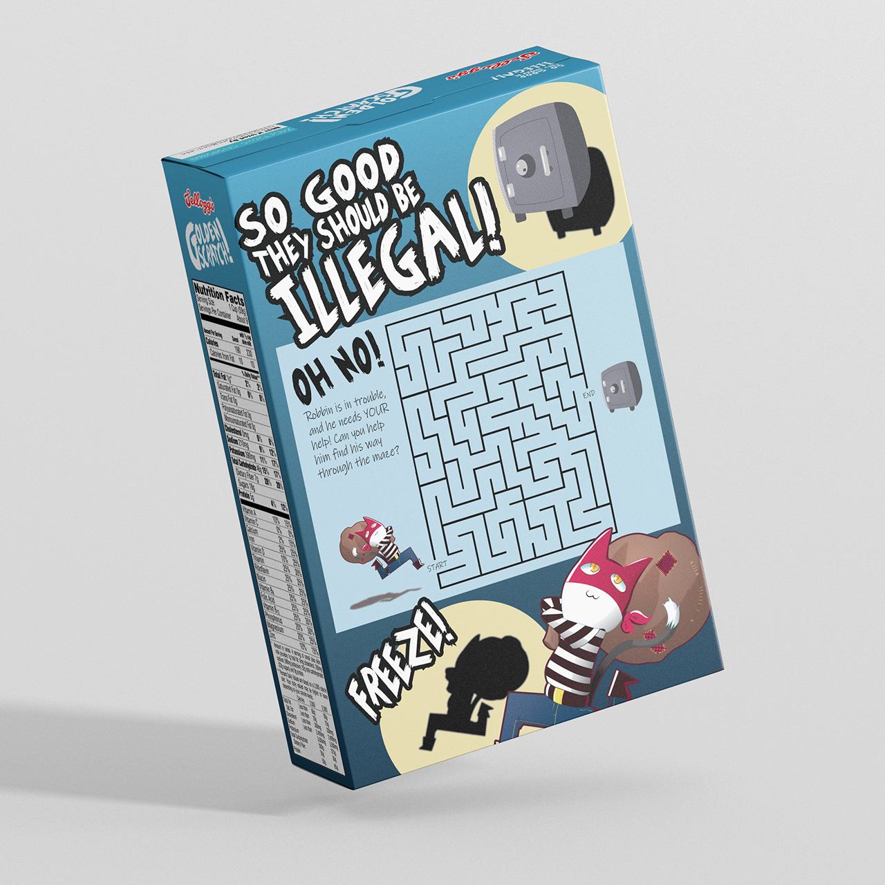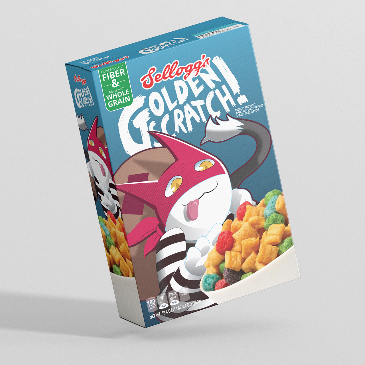 A box of 'Golden Scratch', containing a highly sugary cereal and adorned by the lovable character Robbin' the Cat. 90s style cartoons influenced much of the character design of Robbin', from his animated nature to his need for his own breakfast. The box art is inspired by the designs of early 2000s cereal boxes.