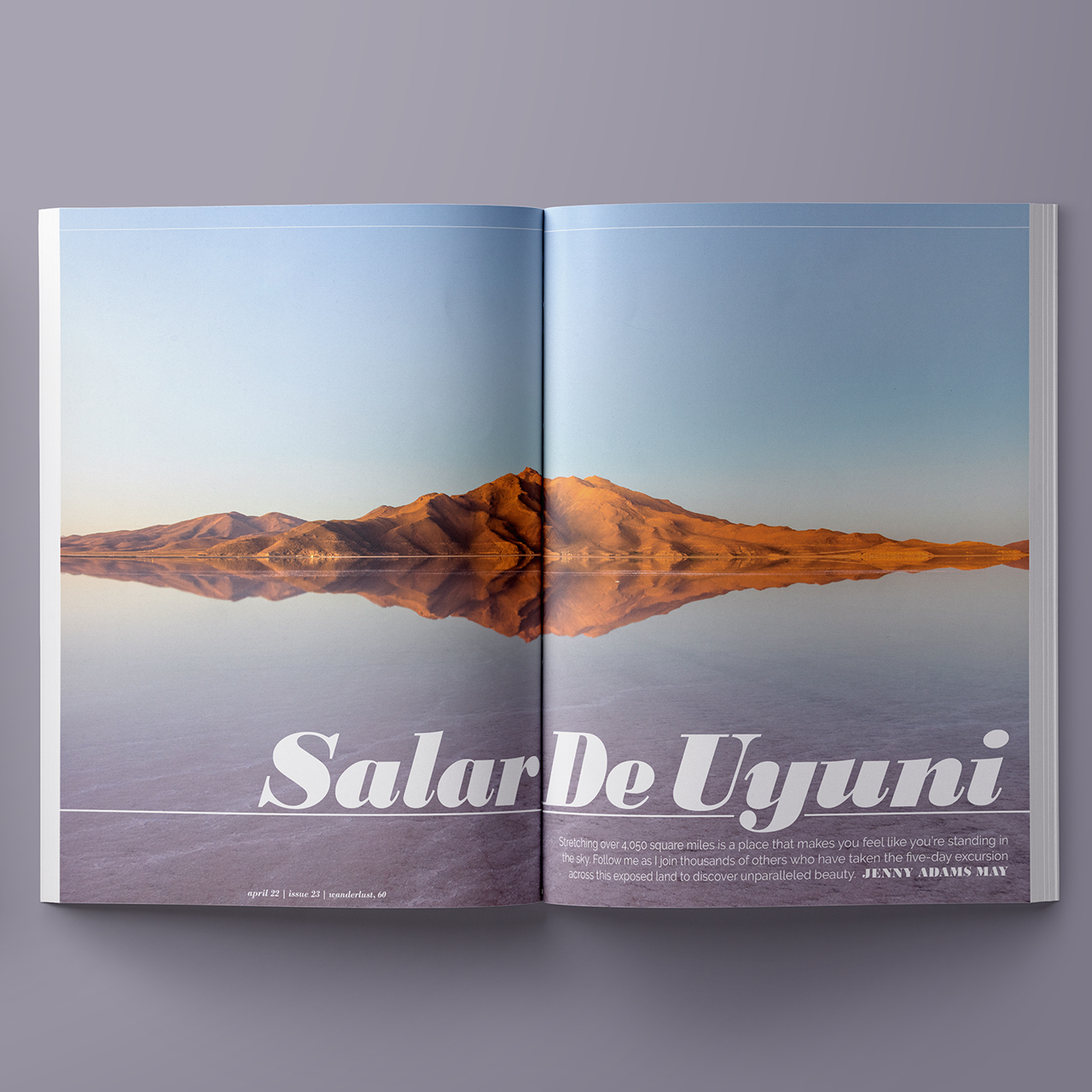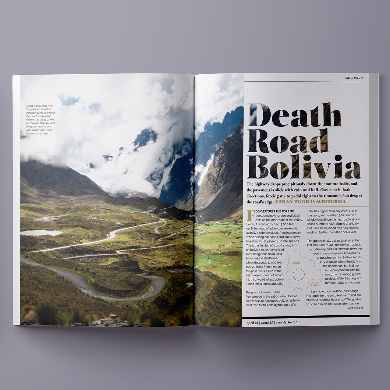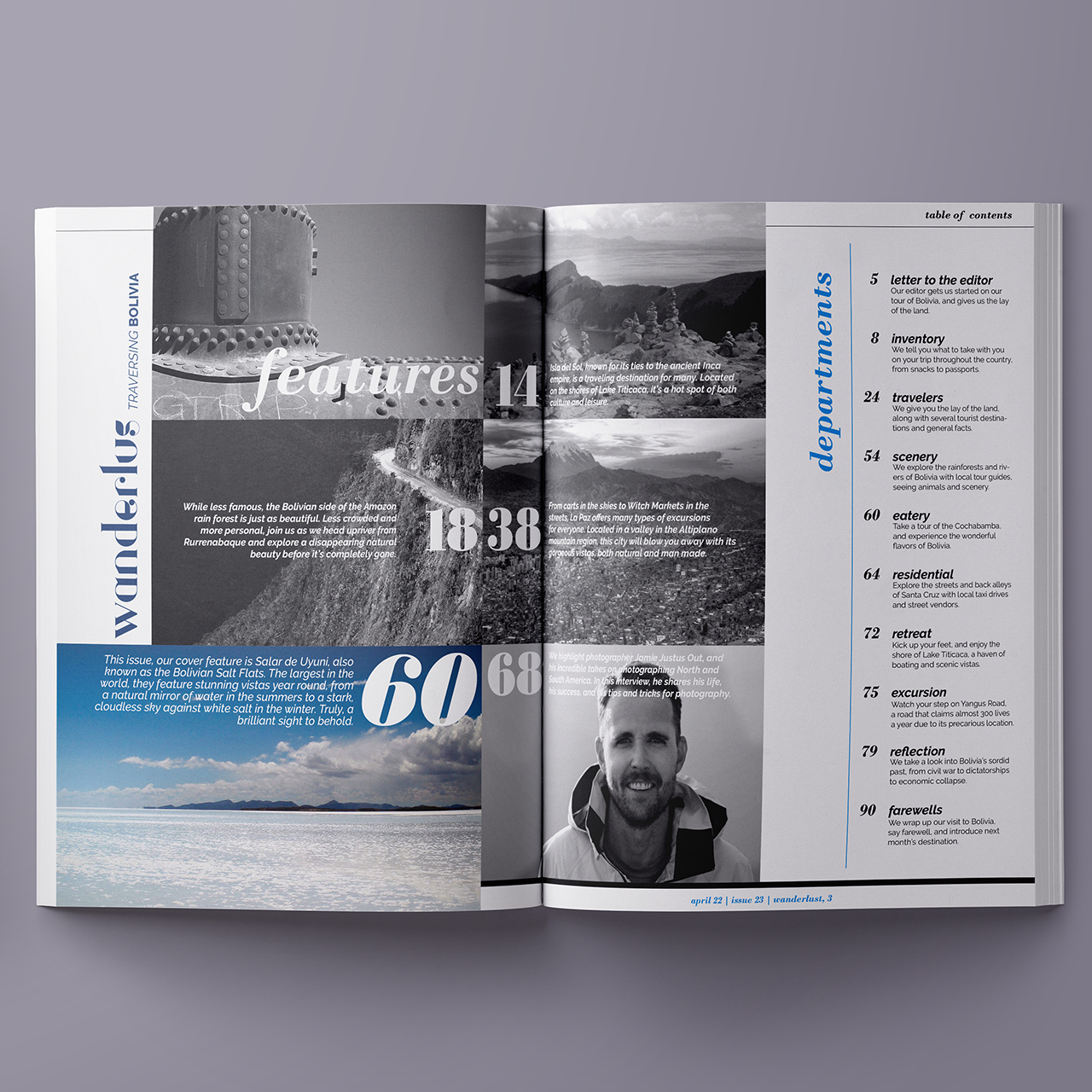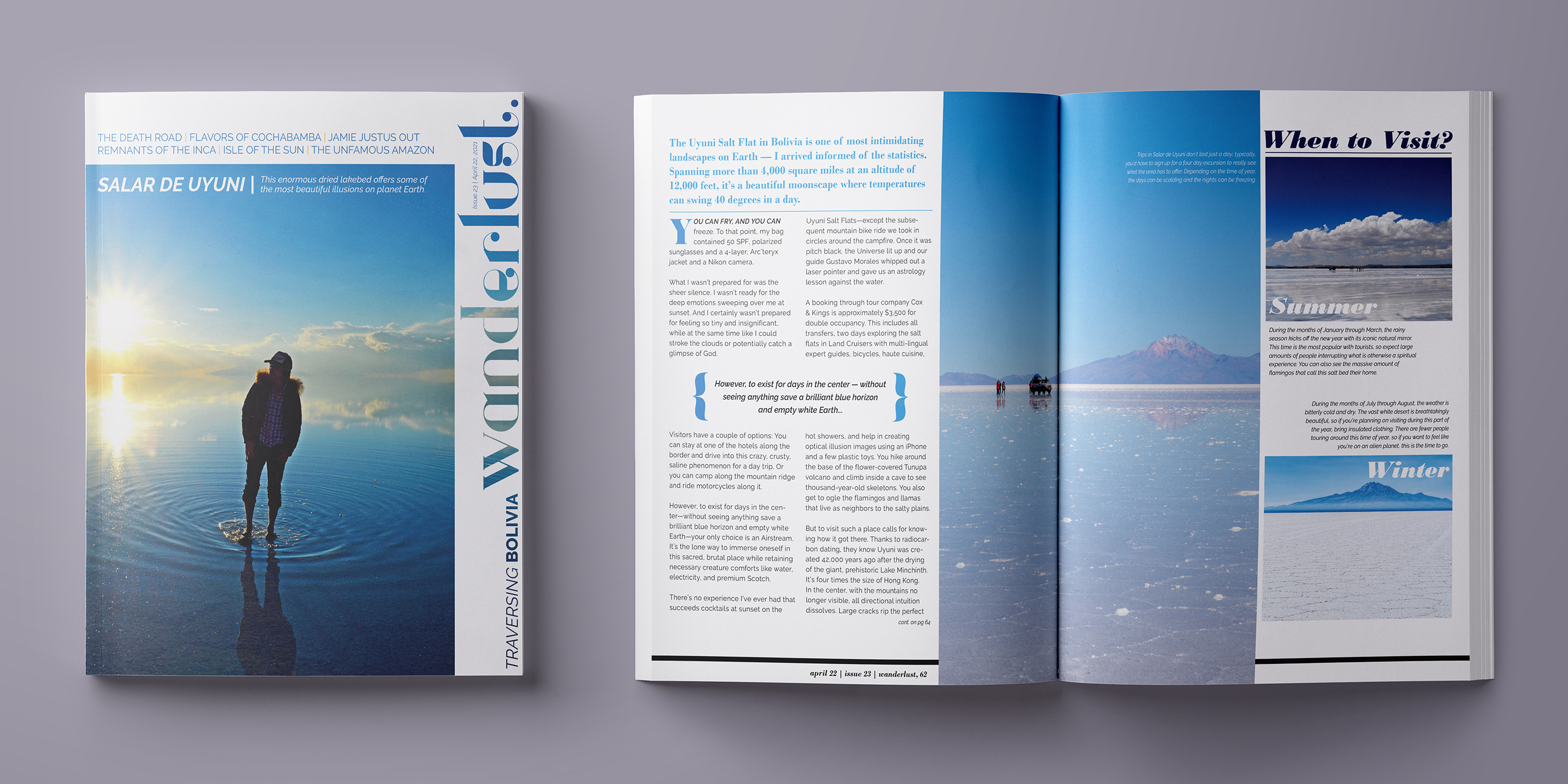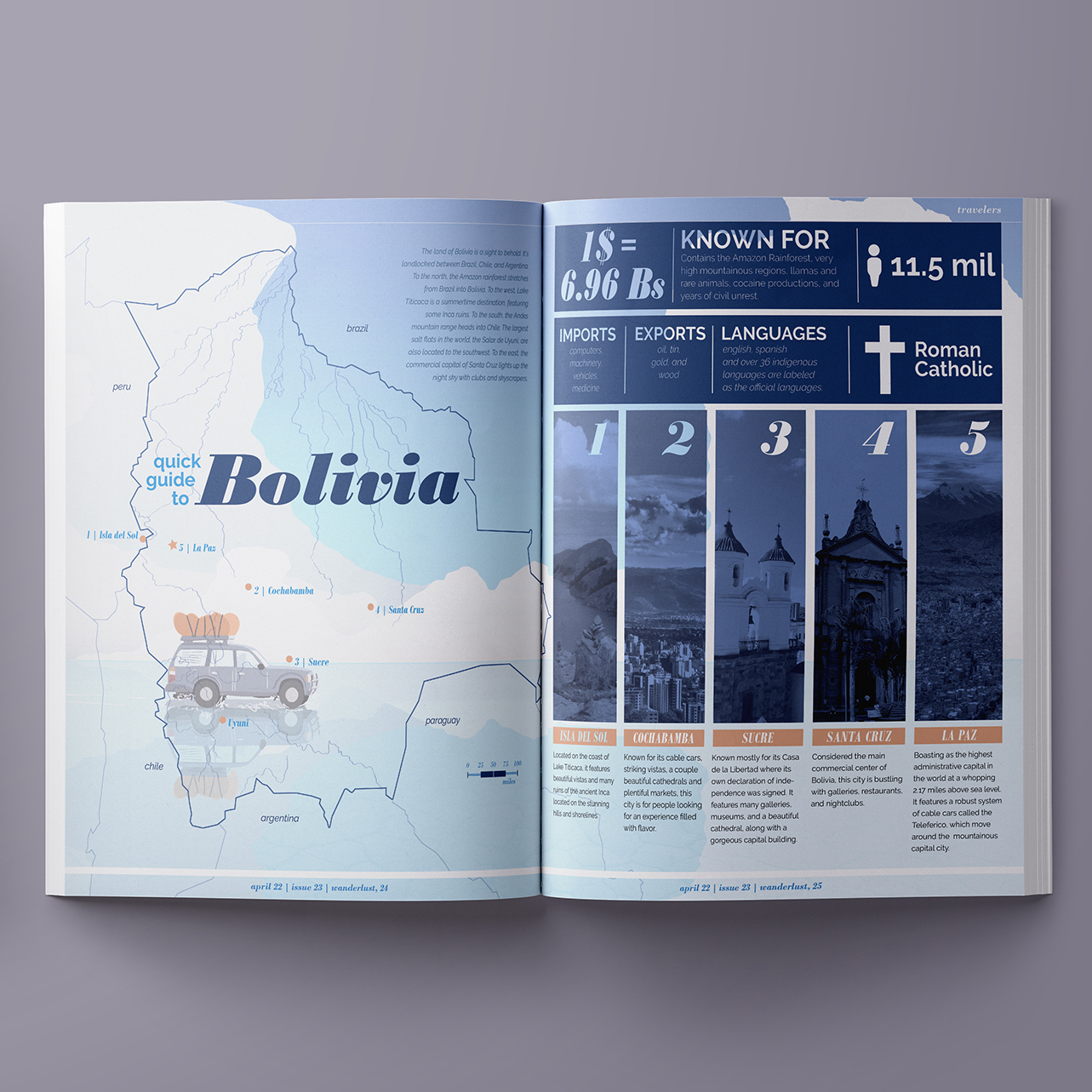 A travel magazine where the writers and editors explore a new country every month investigate everything it has to offer. In this issue, the team explored Bolivia, a dangerous land full of breathtaking views. These included sights like the Bolivian Salt Flats, the Death Road, and a massive train graveyard in the desert. Extensive research was done to fill all twenty pages with engaging and relevant information, including custom illustrations and infographics.