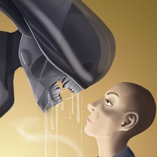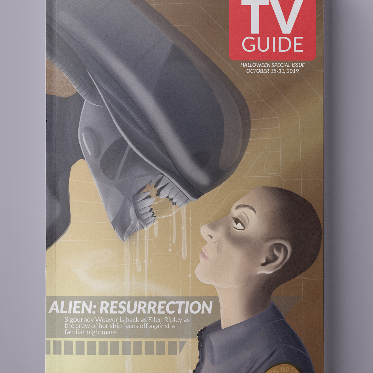 This is a TV Guide cover for the premiere of the new animated ALien series, starring a reimagined Ellen Ripley as she's locked in a familiar nightmare yet again. The painting style is inspired by old science fiction book covers and illustrations, giving it that authentic feeling while still being a new concept.