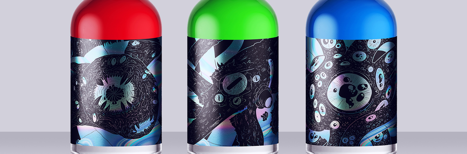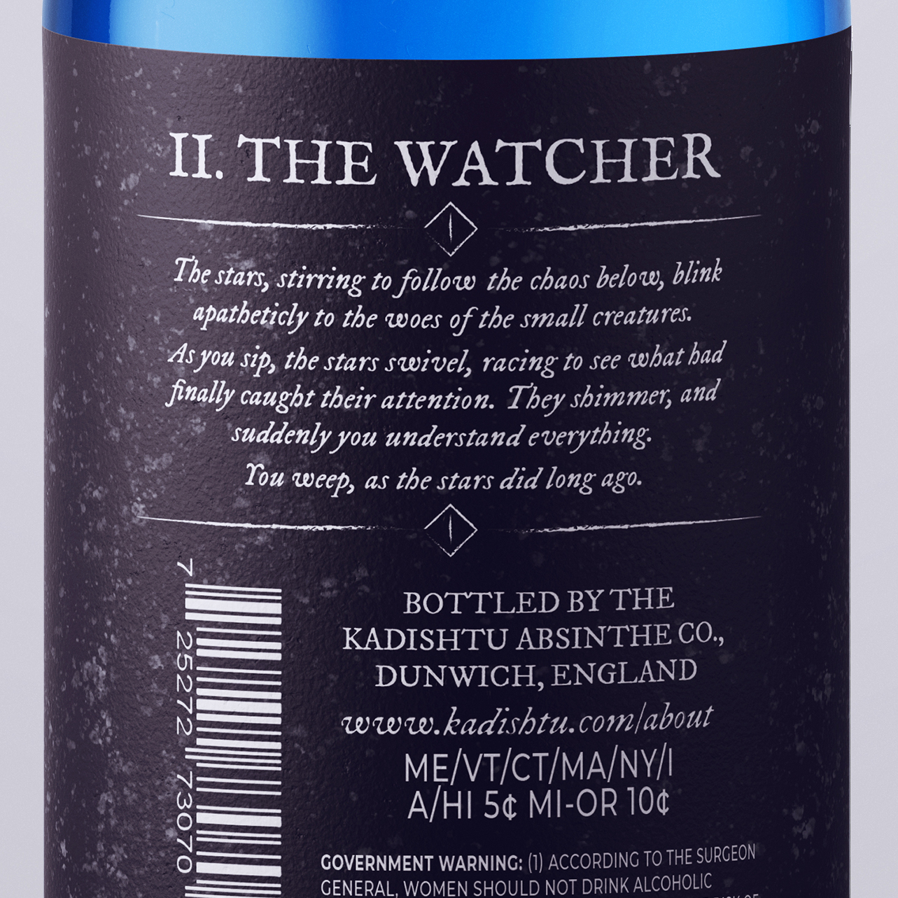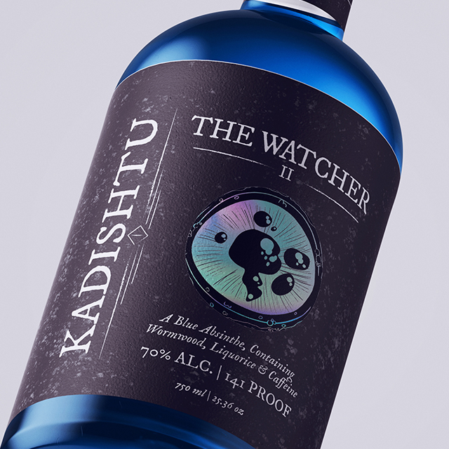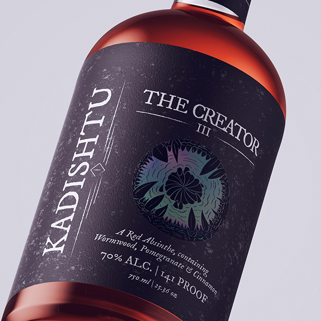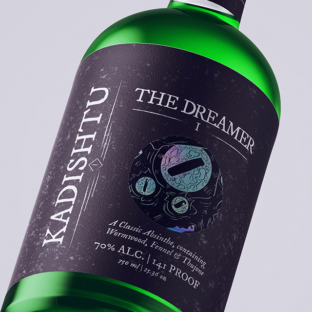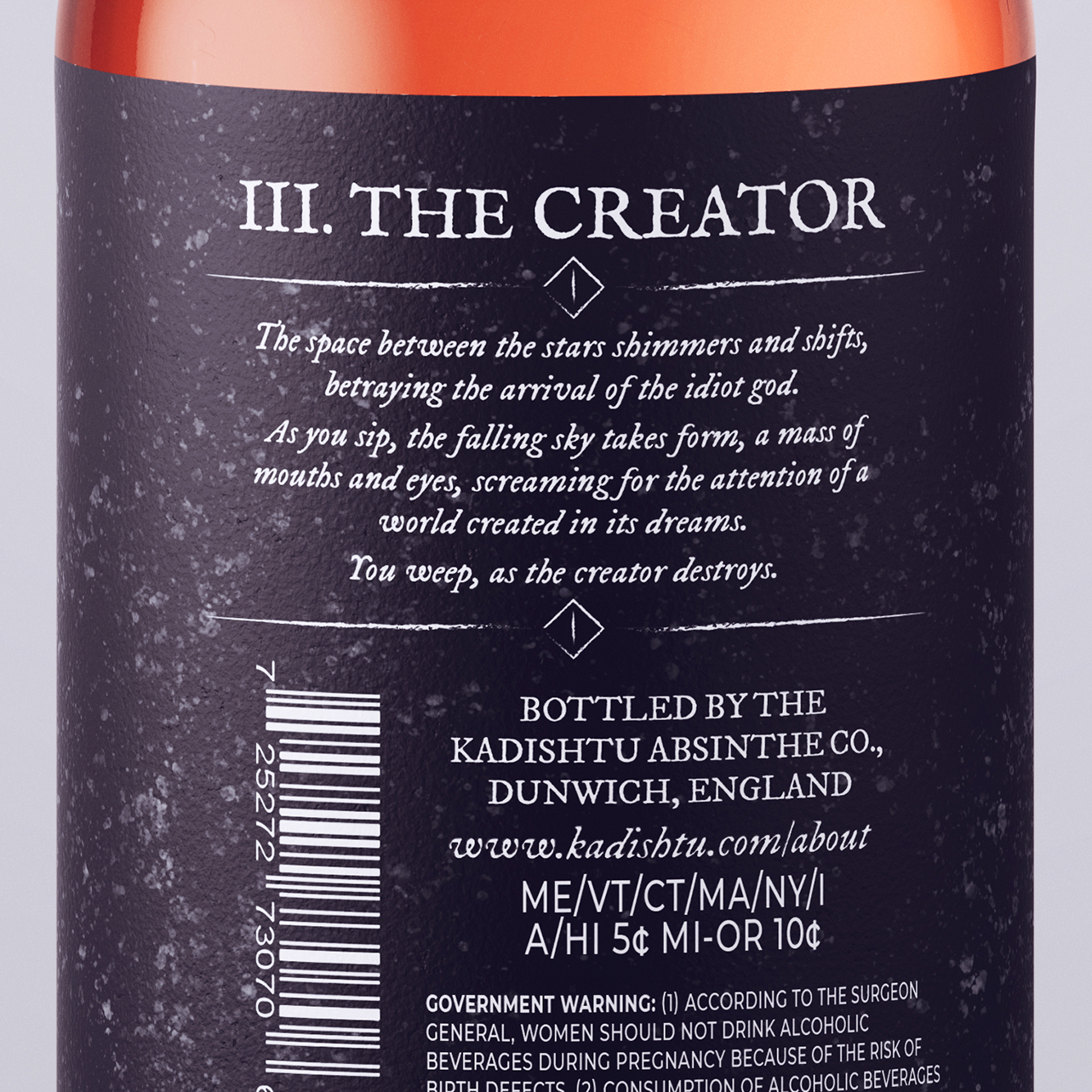 This is a set of bottles from the Kadishtu Absinthe line, a distillery inspired by the former hallucinogenic properties of the green fairy to make their own, more cosmically terrifying version, starring creatures from Lovecraftian fiction. The images underneath the first label seamlessly wrap around the bottle, and with the use of foil stamping, help give the appearance of an unknowable horror. The bottles also all contain a short story, lending into the horror of knowing, with the absinthe itself having properties of its respective Elder god.